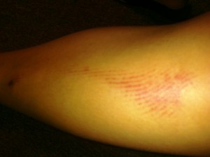 What a WOD!!! I don’t know what I was thinking, but I forgot to write the prescribed box jump heights on the board. For some reason, I had it in my mind that I was supposed to do the 24″ box. Bad call! Ten reps into my second round, I missed the box and fell hard. Notice the pretty little indentations on my gnarly bruise from the lines on the rubber. It hurt like hell, but I went to the 18 ” box and finished the workout. I feel like a dork for going higher than prescribed on accident, but I feel like a total badass at the same time for doing 2 rounds on a 24″ box for the first time ever.