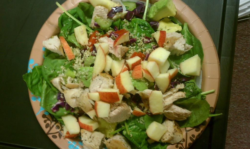 For lunch we had a giant salad with spinach, chopped red cabbage, celery, avocado, tomato, and a bit of apple. It was topped with EVOO and organic, free range chicken cooked in a bit of coconut oil.