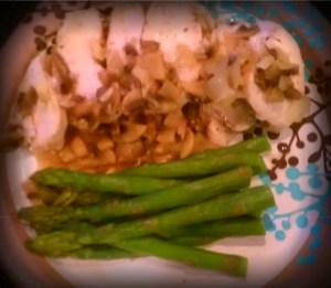 For dinner, we had rosemary chicken and asparagus. It was amazing! First, I cooked the chicken in a bit of coconut oil, seasoning it only with cracked black pepper and a touch of kosher salt. After the chicken was cooked, I set it aside. In the same pan, I put half an onion (diced), 5 cloves of garlic, about two cups of diced mushrooms, and five sprigs of rosemary. I let the veggies sauté until the onions were soft and sweet. Then I just poured