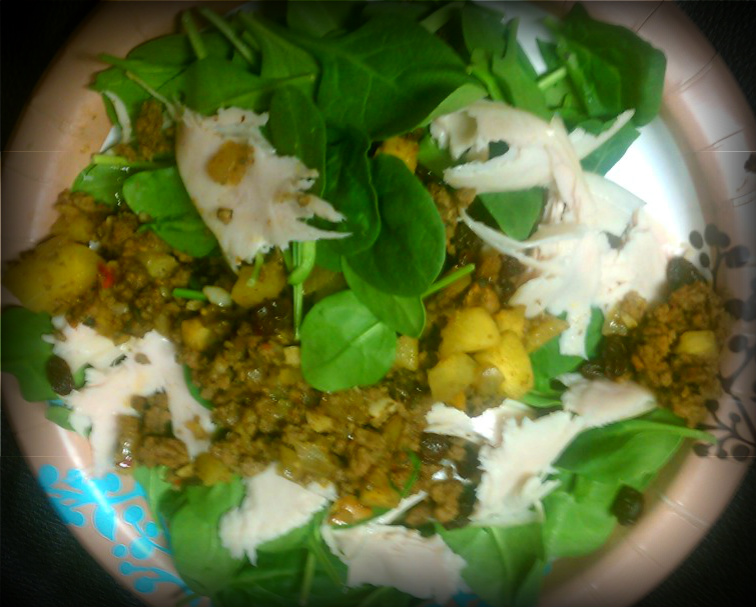 For lunch, I made a salad of spinach, leftover chili, a couple of turkey slices, and some avocado. The chili tasted even better the next day. All the flavors married beautifully. He’s definitely going to have to make that again.