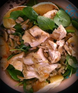Lunch: Leftover over rosemary chicken atop a bed of spinach greens with a few slices of grapefruit.